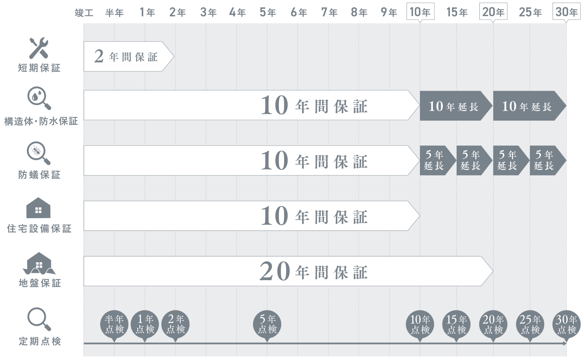 基本構造部分(基礎・柱・床・屋根等)と雨水防水部分について10年間の長期保証をします。10年目以降も規定の工事を実施することで更に10年間保証の延長が可能です。