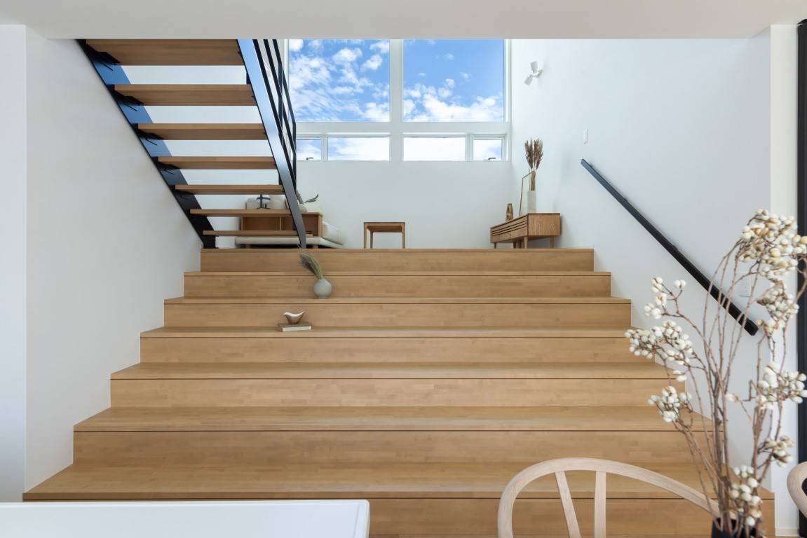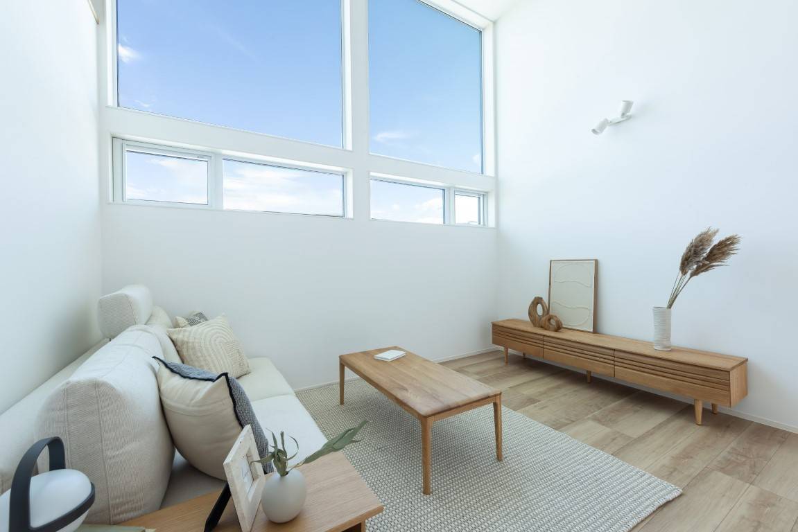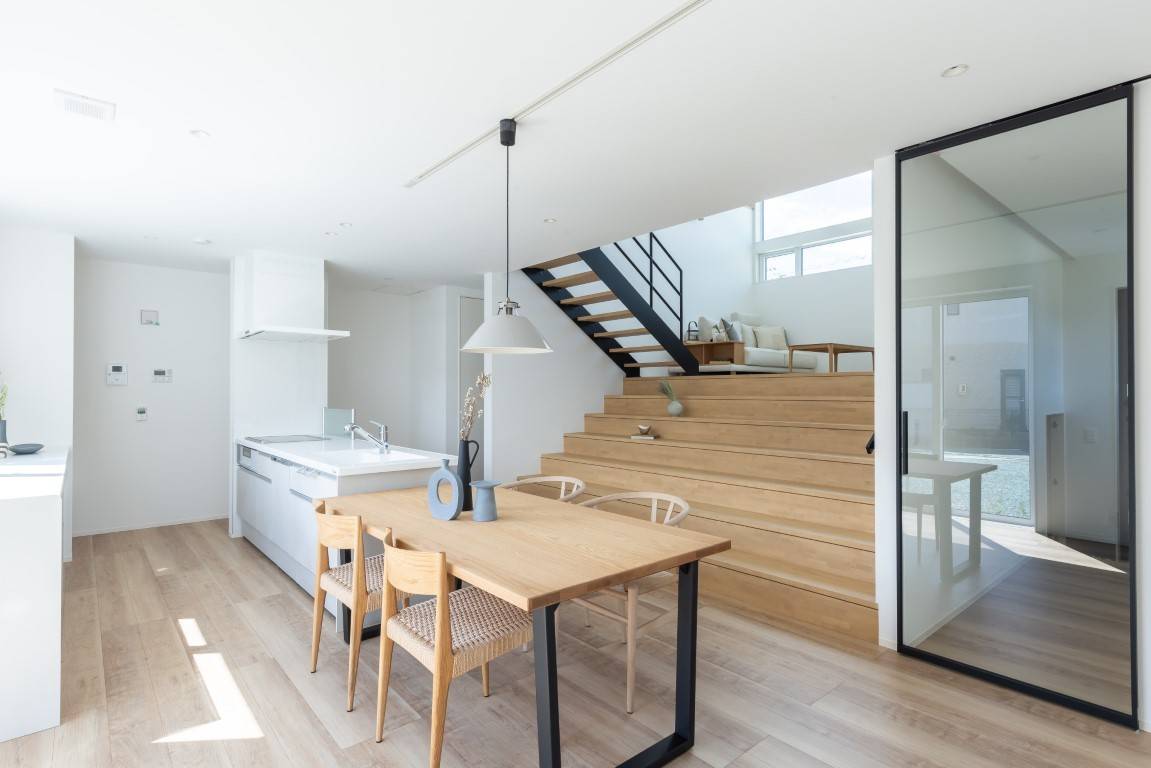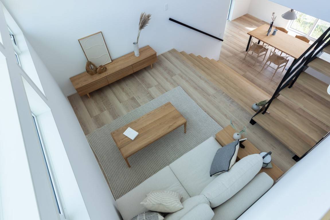 ザ・ビッグまで徒歩9分、村井駅まで徒歩13分。家庭用エアコン1台で夏も冬も家中快適。生活の舞台となる「大階段」を配した住まい。