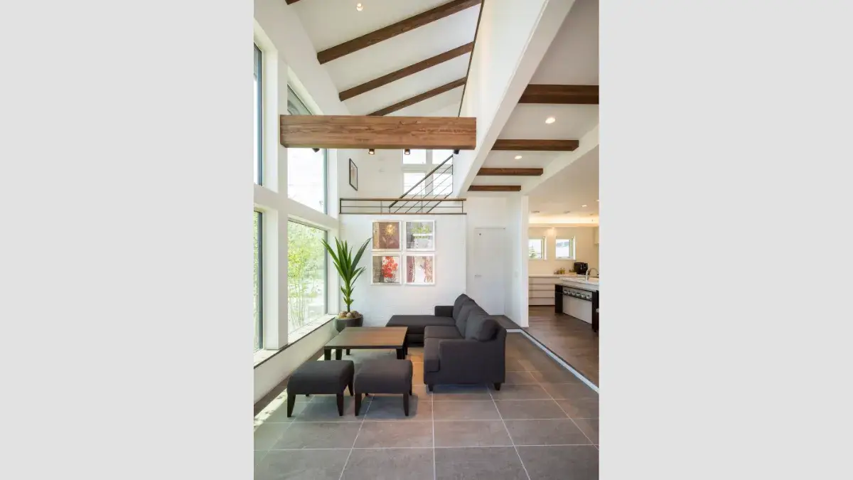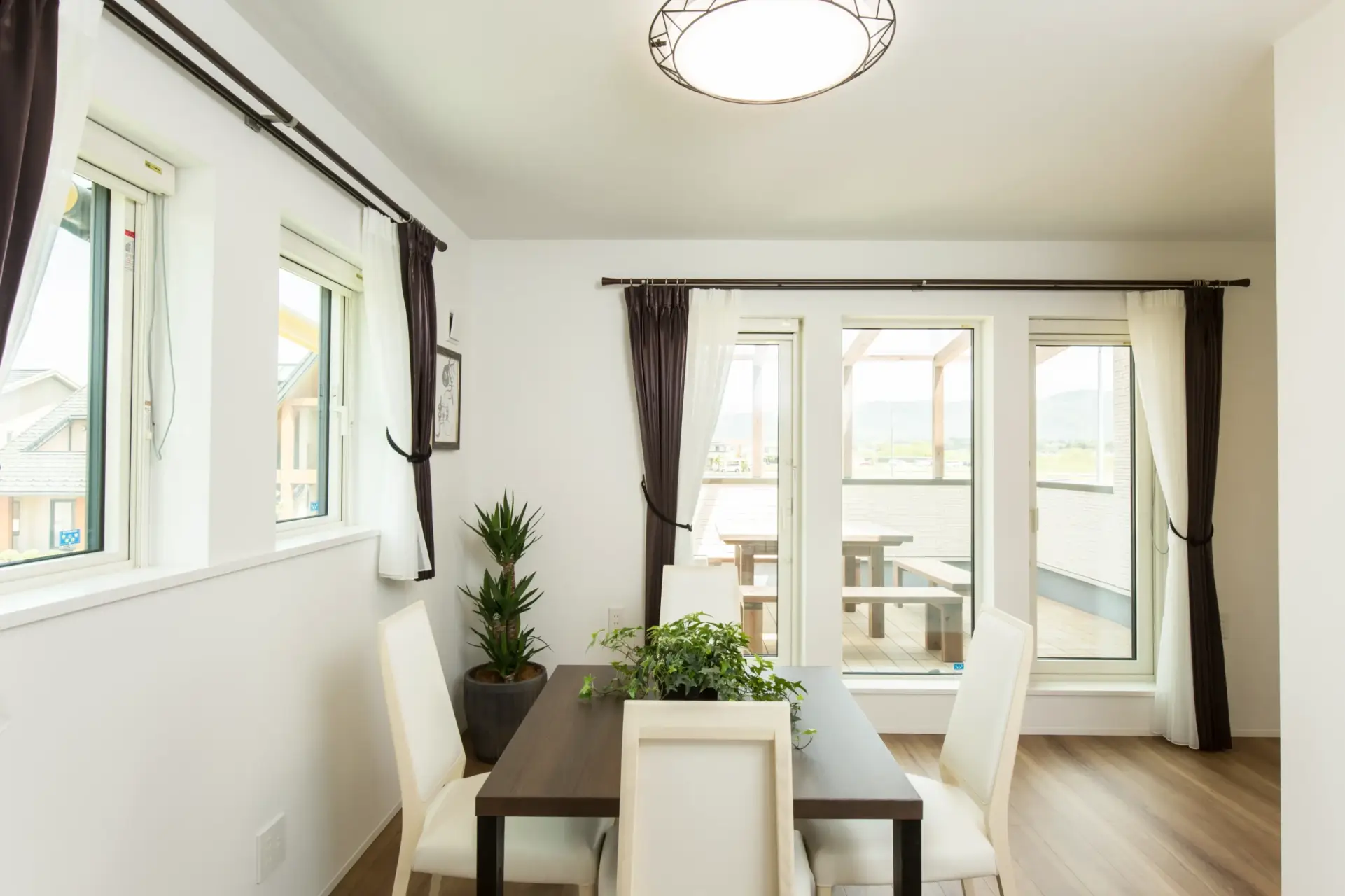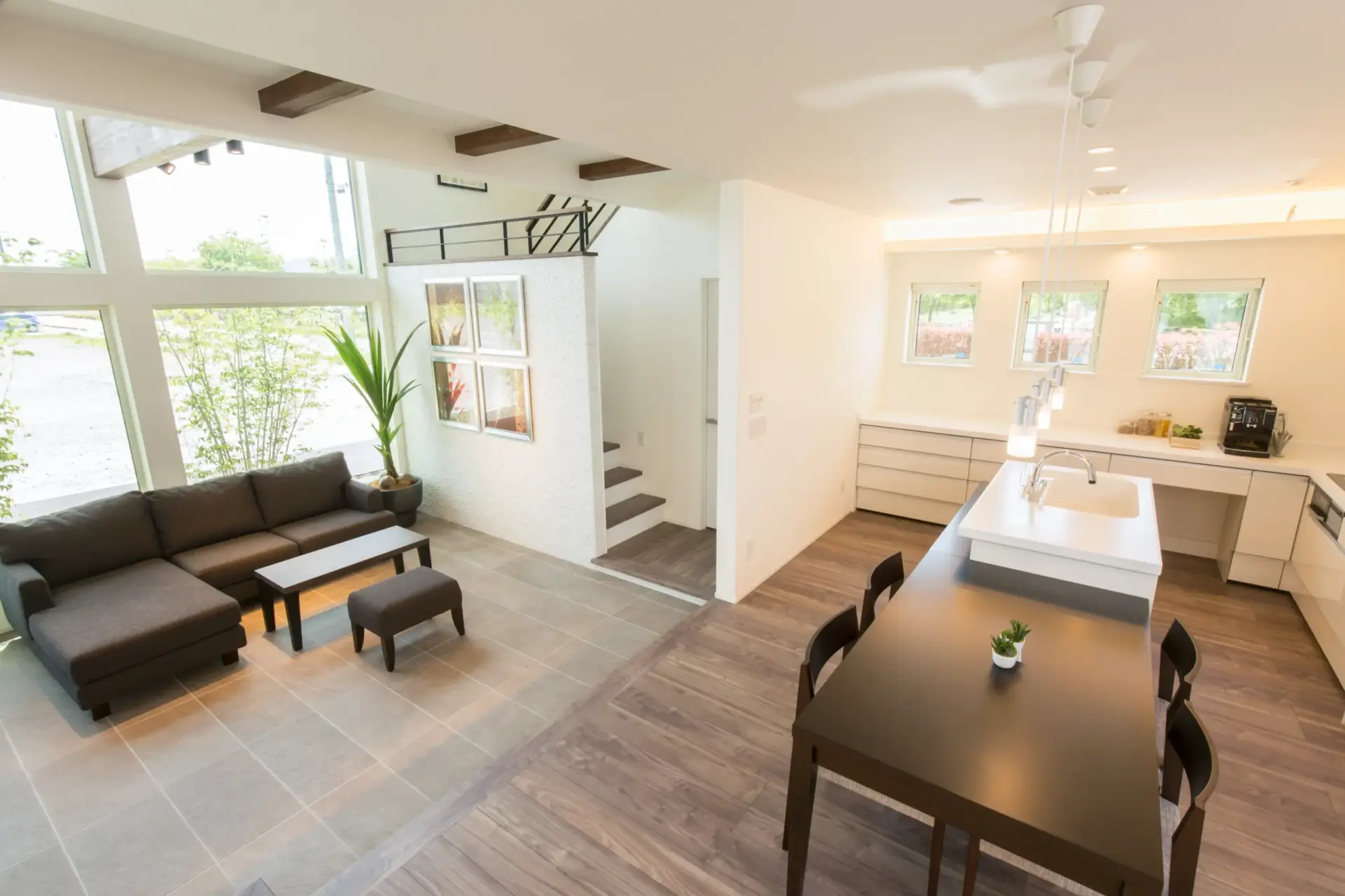 吹き抜けのある明るいリビングで、ホクシンハウスの家中どこでも快適な空間を体験いただけます。