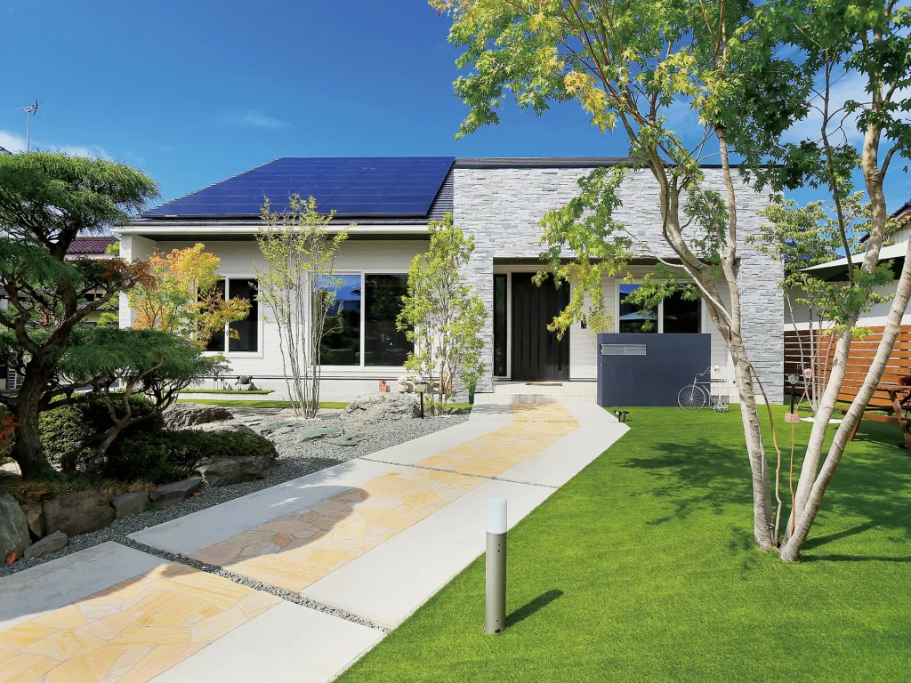 平屋建てに見える外観は 向かいにあるご長男の家とテイストを合わせることにより 落ち着いた街並みを形成している。