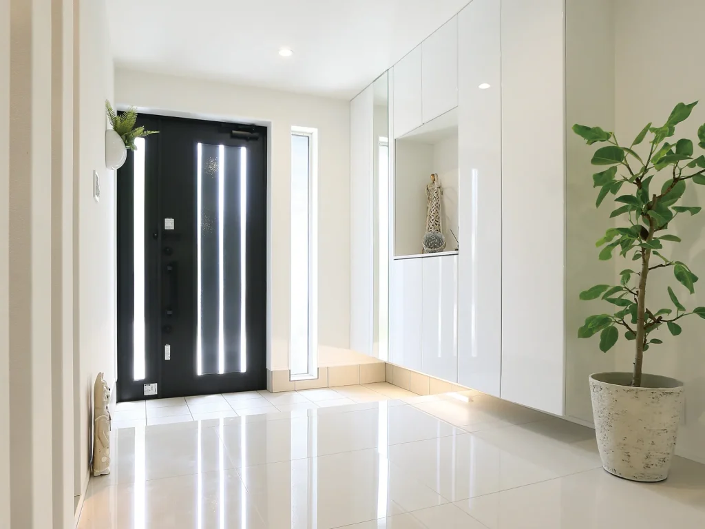 玄関ホールの床は白い大理石。FB工法は床が冷たくならず室内の埃も格段に少ない。