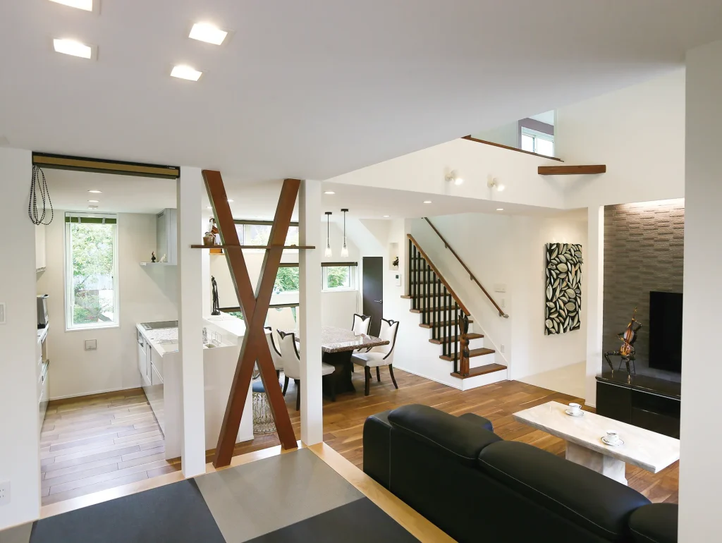 和室からLDKを見る。玄関ホールまで一体となって広々とし、キッチン横は壁にせず 筋交いが程よい目隠しとなっている。