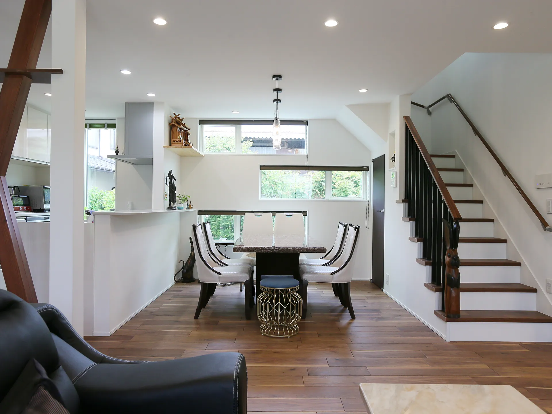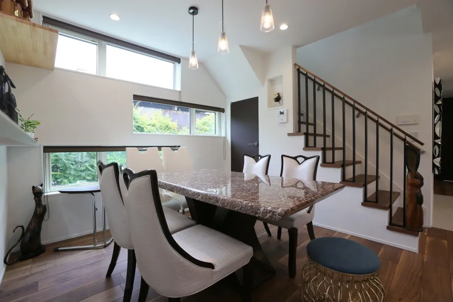 ダイニングの3つの窓がリズミカルに緑の景色を取り込む。