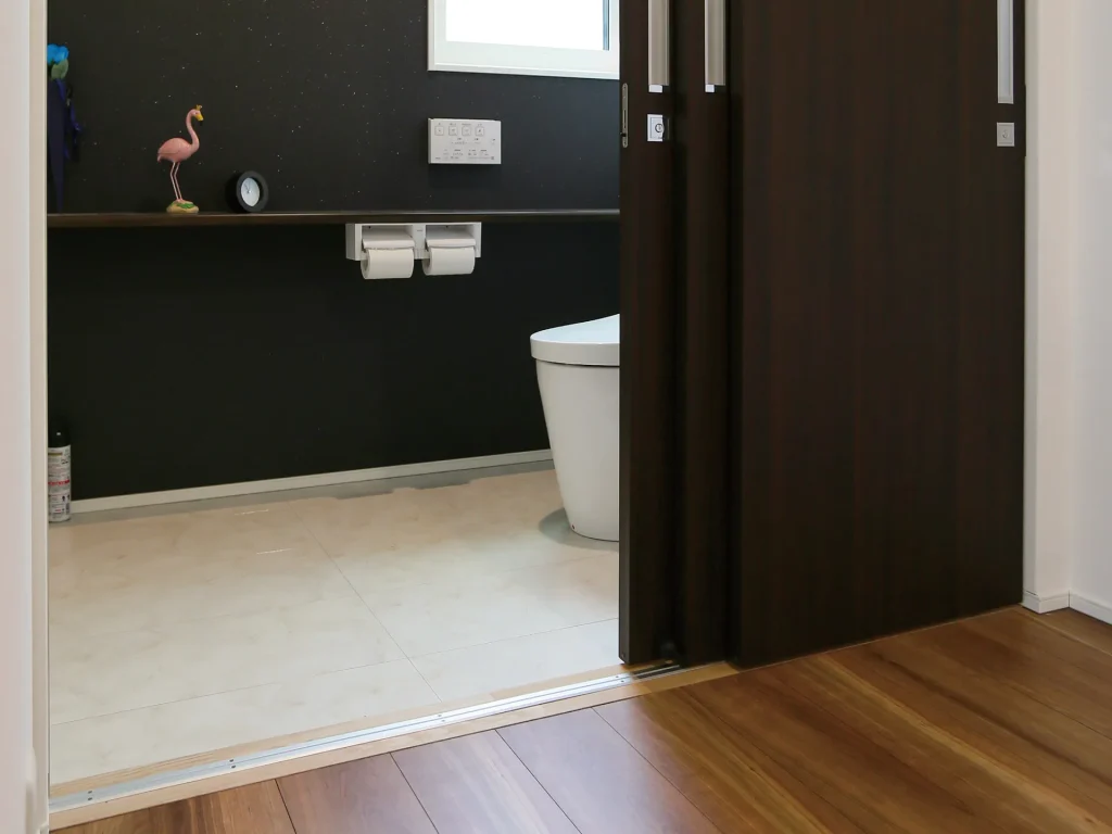 1階トイレは軽い3枚引き戸で 車椅子に乗ったままでも楽に開閉可能。間口も中も広く 接続する廊下は車椅子を方向転換できる広さを確保した。