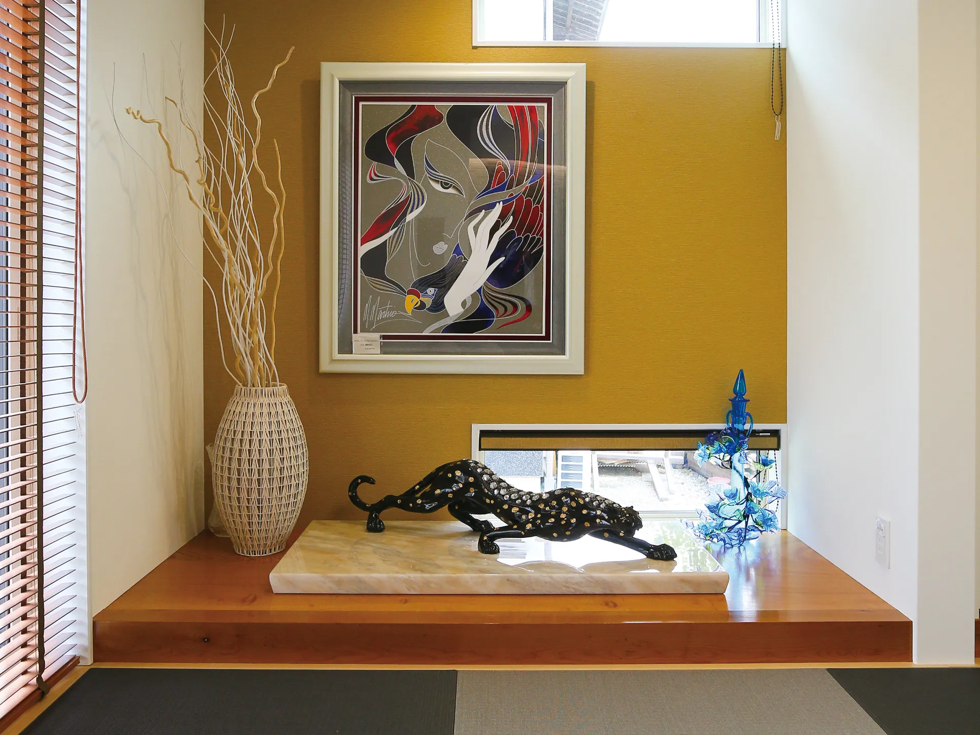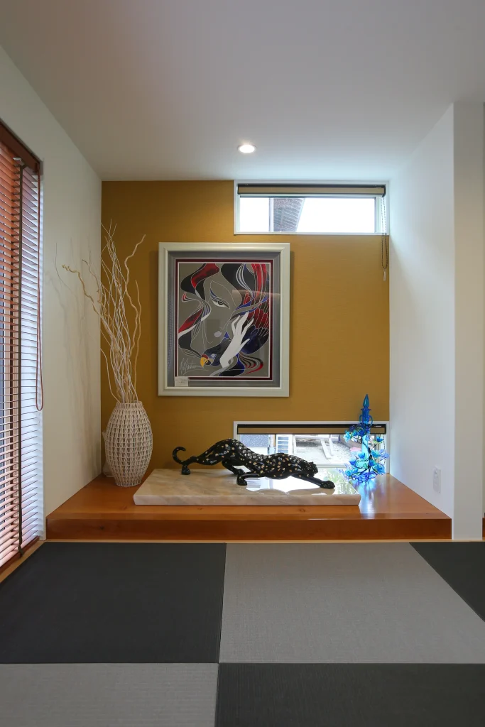 和室の床の間をアートな空間として楽しむ。右側の白い収納部分には 先祖代々の仏壇が大切に置かれている。