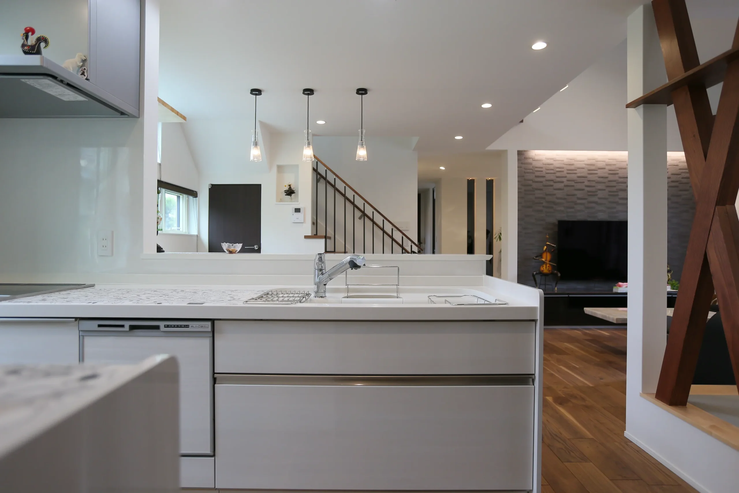 床は1階が重厚感あるウォルナットに対して 2階はエレガントな白にッキまで見渡せるキッチン