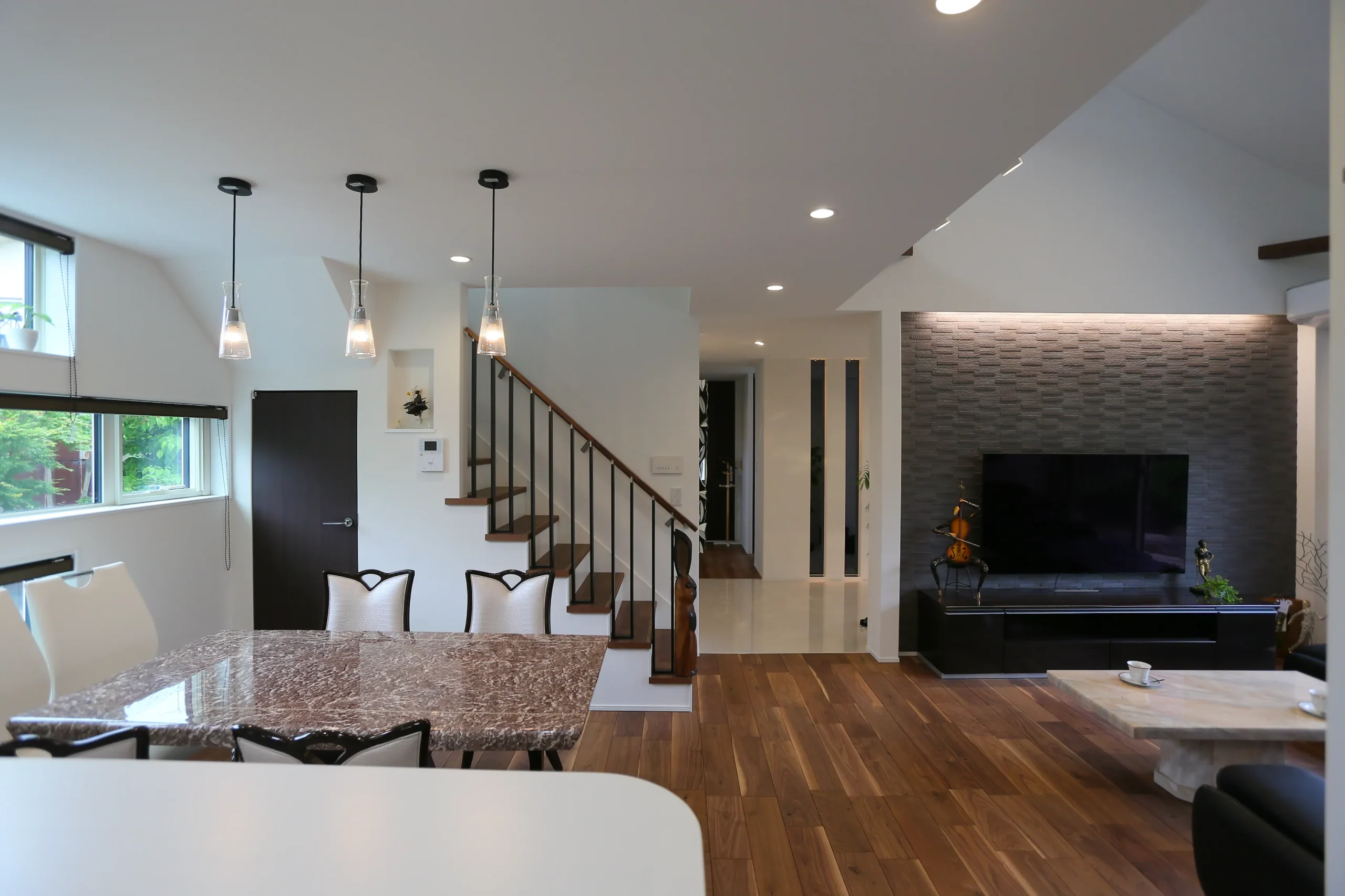 吹き抜け、LDK、和室が一体となった開放的な空間。