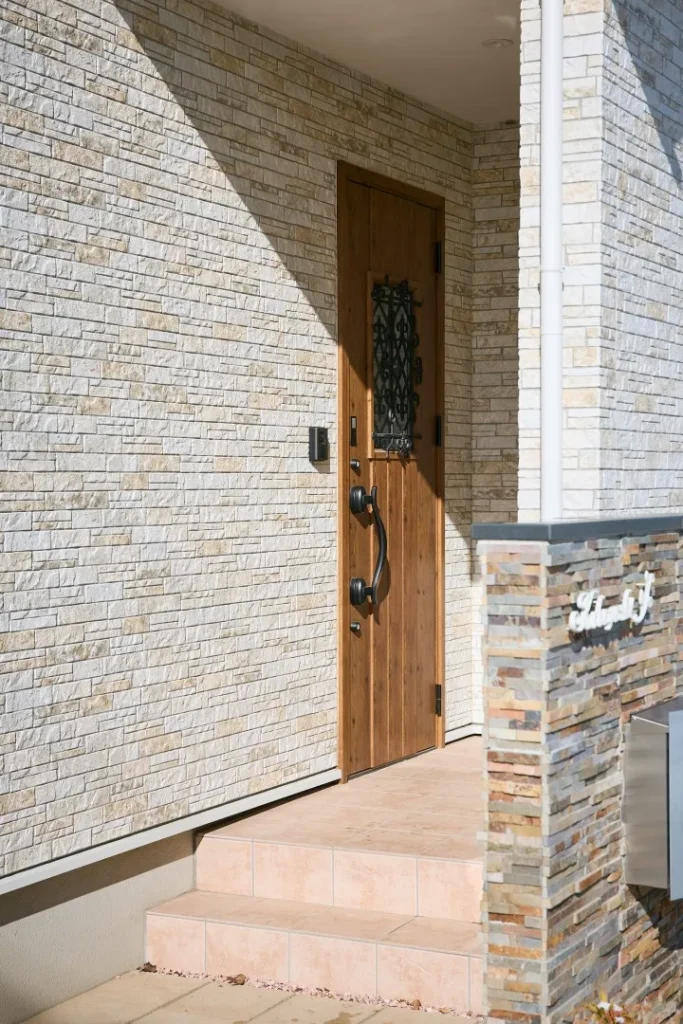 玄関ドアは家の顔、柔らかな窯業系サイディングに重厚な玄関のアンティークドアがアクセントとなり、開けた瞬間に始まるご家族のストーリーを感じるワクワクが詰まった玄関となった