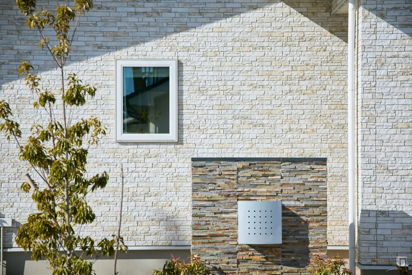 幾層にも重なる石積みの造形に美しい水平ラインが表現豊かな壁面を創り出す。シャープな印象の中にも、手づくりのあたたかみを感じることができ、周囲にも優しく溶け込んでいた。