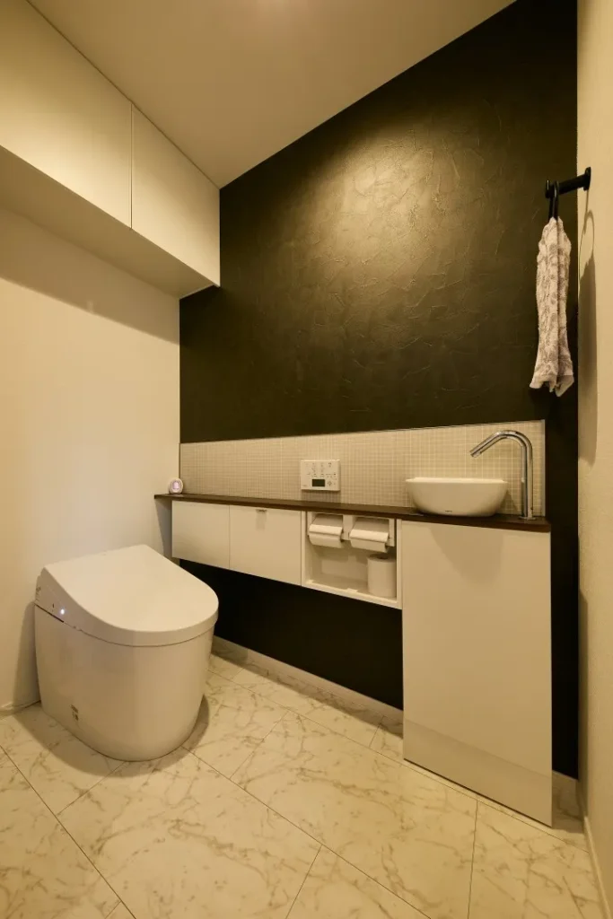 ホワイト大理石調タイル床のトイレ空間に、ブラックのアクセントクロスでモダンな印象のトイレは玄関に入ってすぐの場所に配置。将来のことを考えた設計士からの提案で広さも確保。