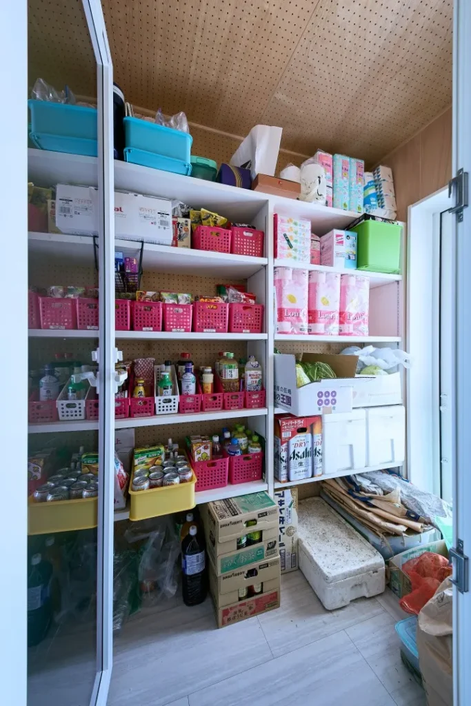 食品庫は気密外となっているため、冷えた空間になっている。ビールなどの飲み物や冷蔵庫に入り切らない野菜、調味料など、区分された可動棚に整理整頓し、きれいに収納されていた。。