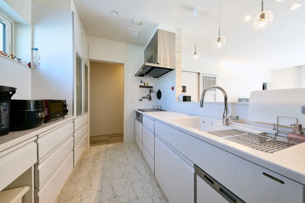 キッチンの通路幅は、廊下から浴室・洗面スペースへ抜ける通路でもあるため、広さを確保。背面収納も丁度良い容量。