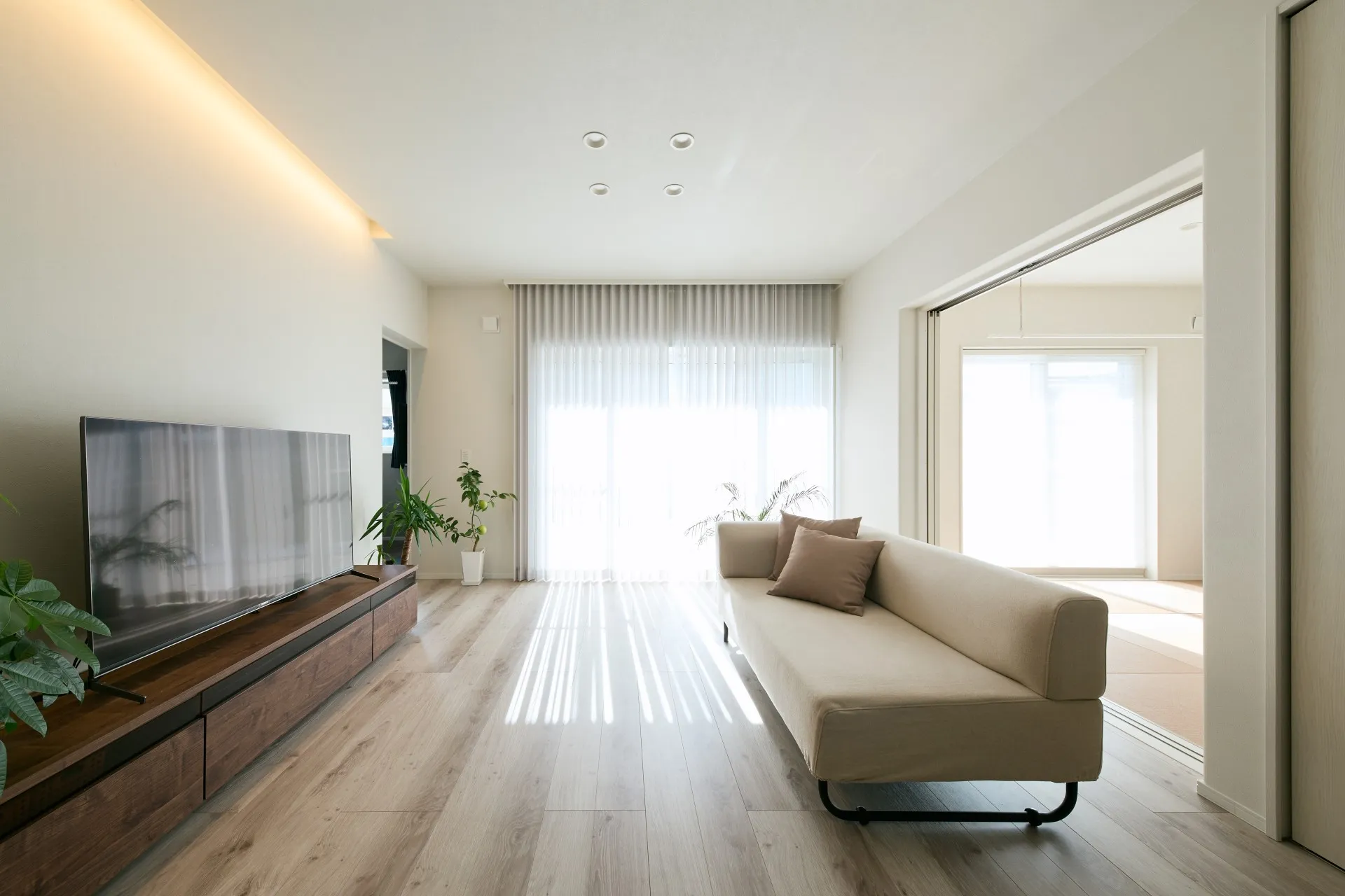 和室からリビングを眺めると、間接照明に柔らかく演出されたリビング空間が広がる。シーリングライトでは再現できない、壁に当たり拡散された柔らかい光がリラックスシーンを演出。調光も可能。