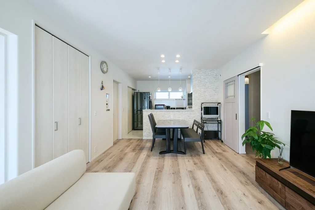 バーチカルブラインドが織りなす光と影がLDKのあたたかな空間美を演出