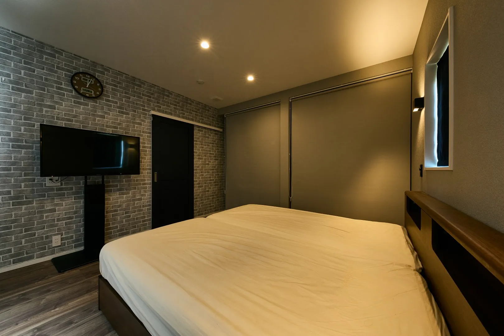 寝室は暗めの配色で落ち着きを演出。調光可能なブランケット照明が間接的な明るさで雰囲気を醸し出す。クロスも暗めの石目調を採用し、扉も合わせてネイビーブルーの上吊り引き戸にでトーンを統一した。収納は2つをご夫婦で分けて使用し、それぞれを仕切るロールスクリーンの色合いも周りと合わせた。