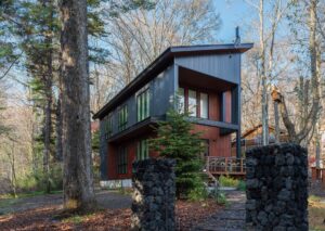 メンテナンス性を考慮し、外壁には木目調のサイディングを採用。中央にはセメント調の外装材「ソリド」を配し、森の景色に溶け込みつつモダンさも薫るデザインに仕上げた。