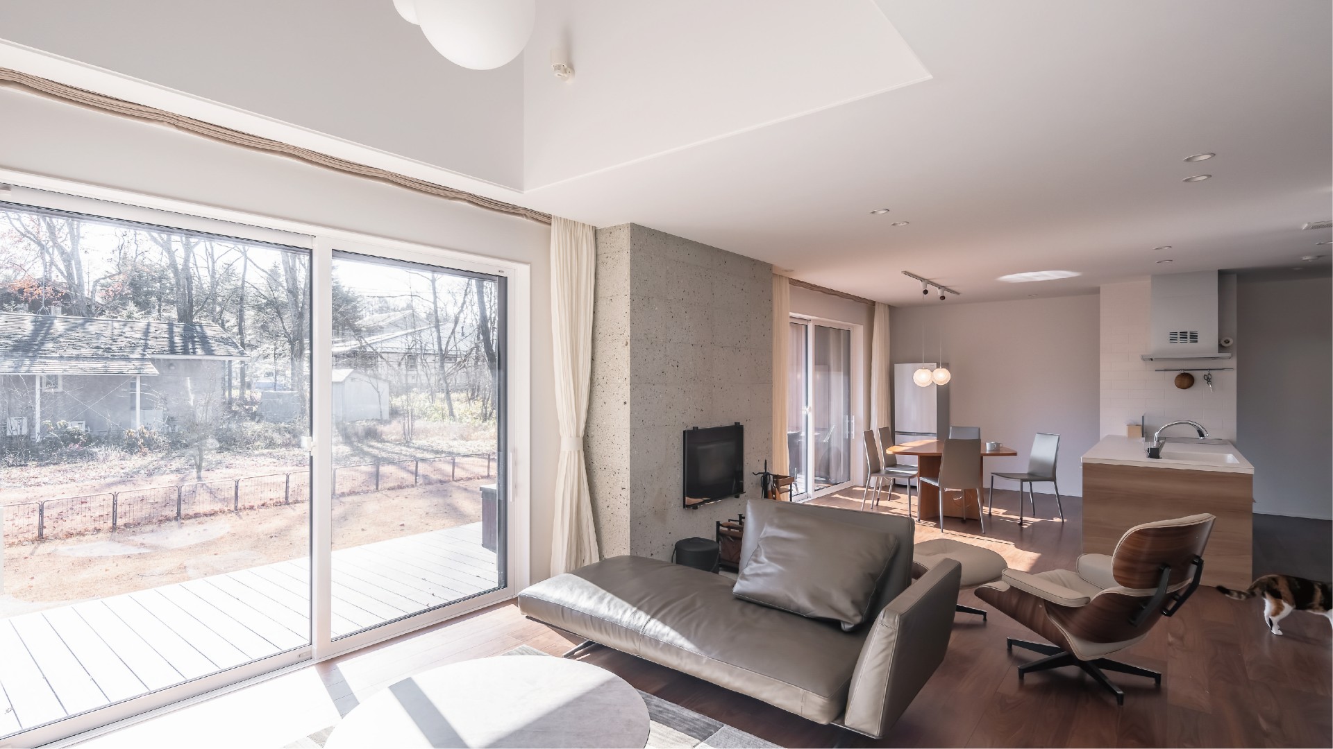 大谷石をあしらって、すっきり納めていただきました。本当は真冬でも火を入れなくていいほどポカポカですが、わざわざ薄着になって薪ストーブを楽しむことも。夜、お酒を飲みながら炎を眺める時間は至福のひと時ですよ」。
