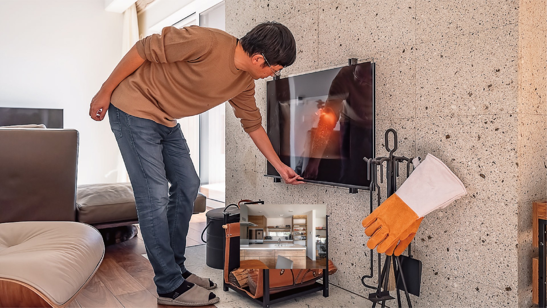 炎を眺める至福のひと時、薪ストーブ「薪ストーブは僕のこだわり。大谷石をあしらって、すっきり納めていただきました。本当は真冬でも火を入れなくていいほどポカポカですが、わざわざ薄着になって薪ストーブを楽しむことも。夜、お酒を飲みながら炎を眺める時間は至福のひと時ですよ」