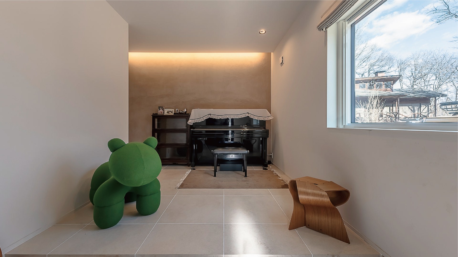 奥行きたっぷりのホール正面には、奥さまの趣味のピアノを置いた。「子どもが思いっきり遊んで汚しても良いスペースが欲しかったので、空間全体をタイル敷きで統一しました」。
