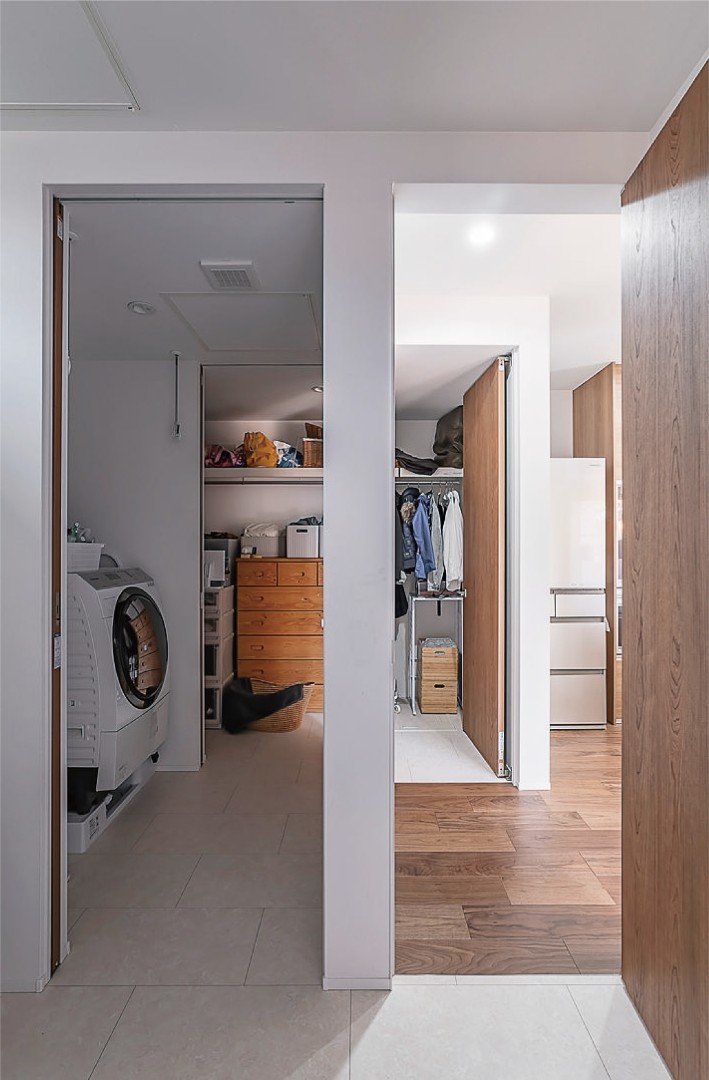 WIC(奥)と洗面脱衣室(手前)は、LDKとつながるドアをそれぞれ設けたうえで、中間にランドリールームを配置。引き戸を開けると洗面脱衣室・ランドリー・WICが直線でつながり、洗濯家事動線が最短距離となる。引き戸を閉めれば生活感が一掃され、見た目すっきり