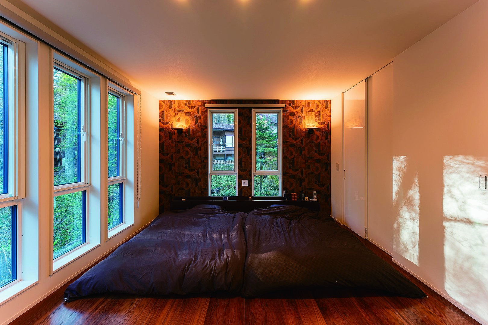 寝室は、奥さまの好みを反映したアクセントクロスが大人の雰囲気を漂わせる。北側には空調室があるが、騒音が気にならないよう配慮された独自のシステムにより、リラックス空間を全く邪魔することがなく安心して過ごせる。