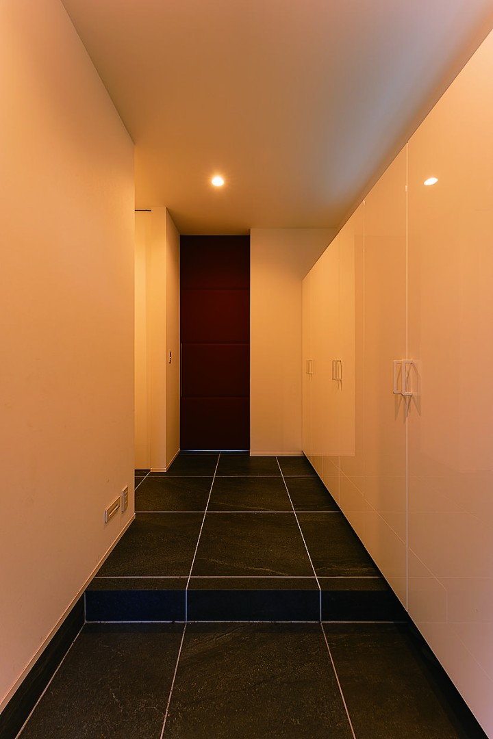 玄関からリビングへ続くドアはエルメスの革を使用したオーダーメイドのもの。右手の収納扉にはツヤのある鏡面素材を多用しており、高級感が漂う。