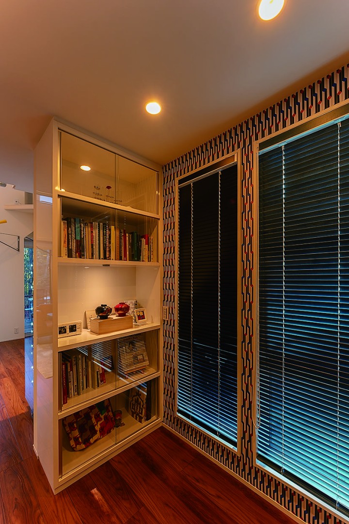 アート、建築、ワイン、料理などご主人の多趣味ぶりが伺えるディスプレイ棚。収納はそこまで多く設けず、お気に入りのものだけをストック。ゆとり時間を過ごす別荘ならでは。