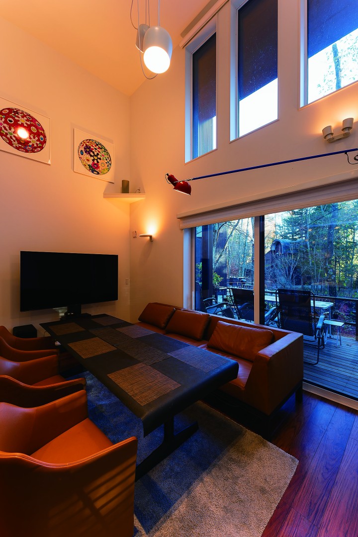 吹き抜けのあるLDK。窓を大きくすることで自然と一体化する、開放感抜群の魅力的な空間。サッシはトリプルガラスを標準採用。高い断熱性能だからこそ叶えられる大開口は、モダンなデザインとも相性が良い。