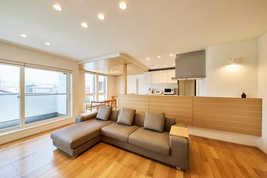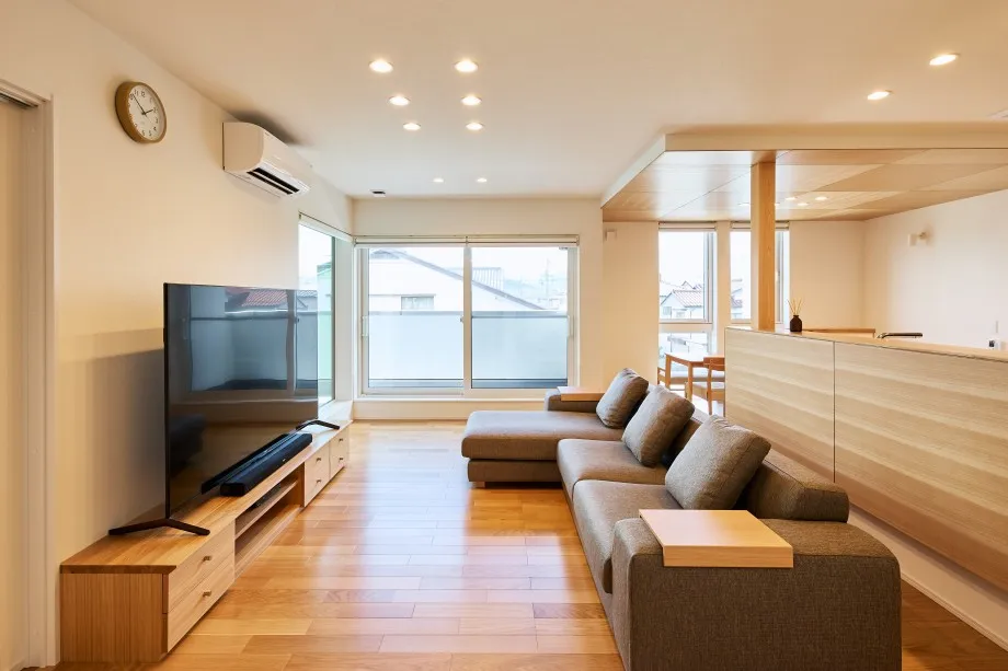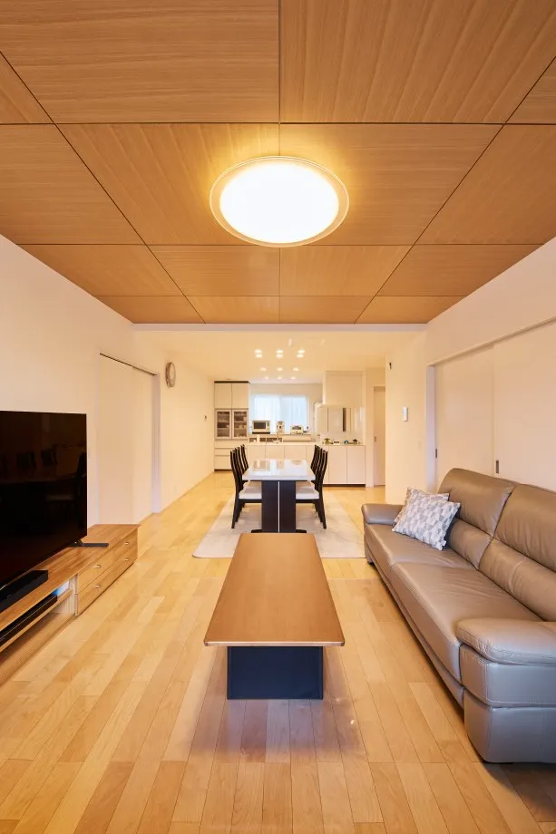 リビング部分に木目の天井を入れ ダイニング・キッチンとは壁を隔てずとも空間として仕切られている。