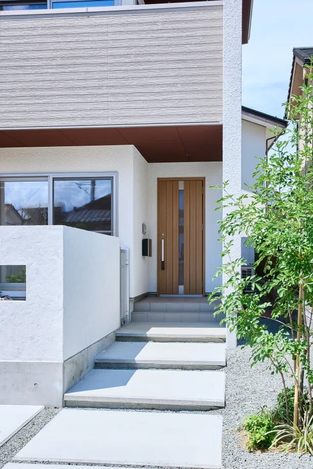 オープン外構に圧倒されるが 緩やかに玄関へと導く幅をしっかりとったアプローチで緩急を。