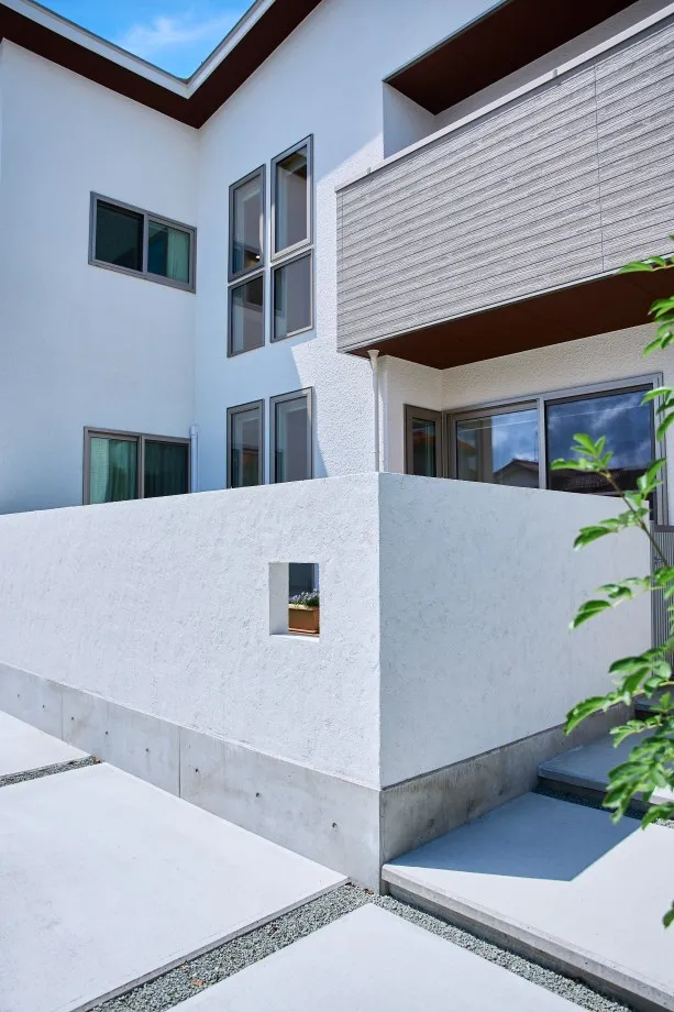 中庭と外を隔てる壁は 1階の目隠しの役割も果たす。壁には四角いスリットをつくり遊び心をプラスした。