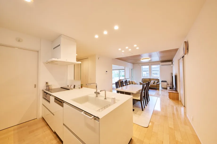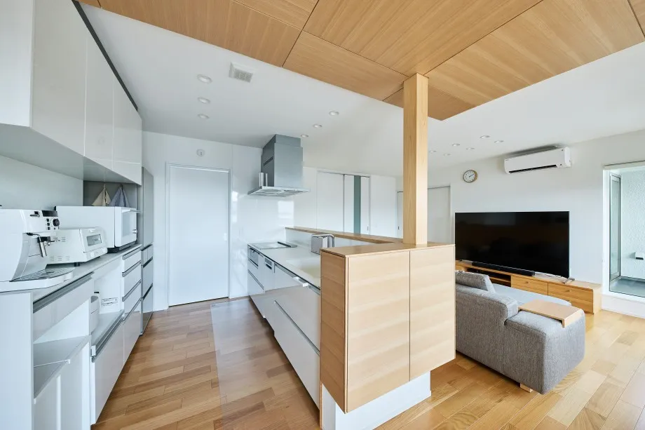 リビングを見渡すことができる2階のキッチンでは 小さなお子様を見ながら安心して家事ができる。
