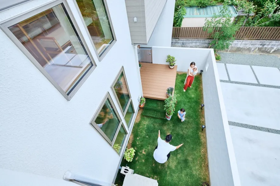 庭は芝が敷いてあるので小さなお子様が走り回っても安心。塀のおかげでまわりの目を気にすることなく 思う存分遊ぶことができる。