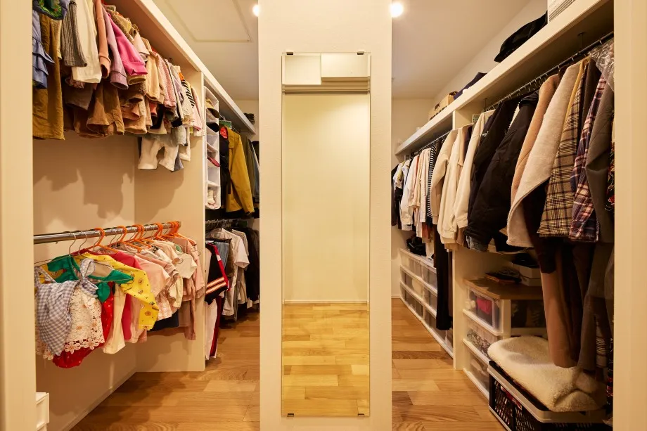 家族全員分の衣類が入る大容量の2階ファミリークローゼット。入り口正面には鏡を設け 支度時にはこの空間で準備が完結する。