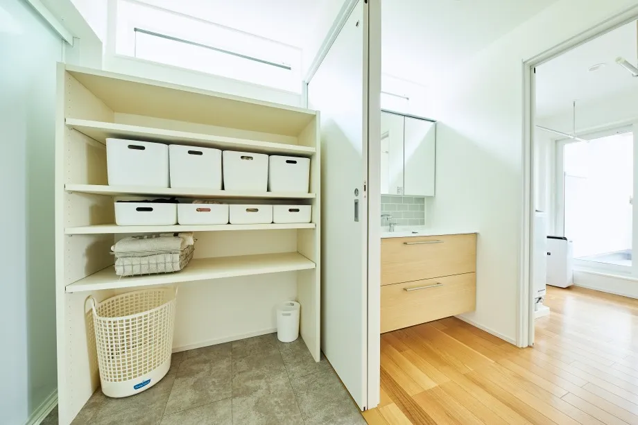 脱衣スペースは広くとり 収納も多く設けたのですっきり片付いている。