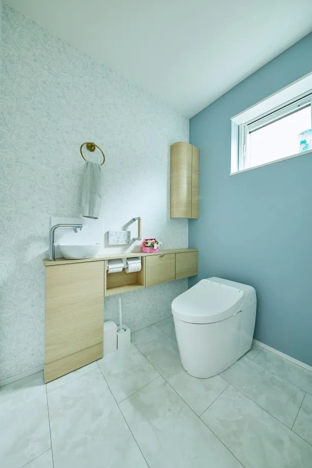 1階のトイレは天井、西壁、他壁で3種類のクロスを使用し 全体的に爽やかな印象になった。