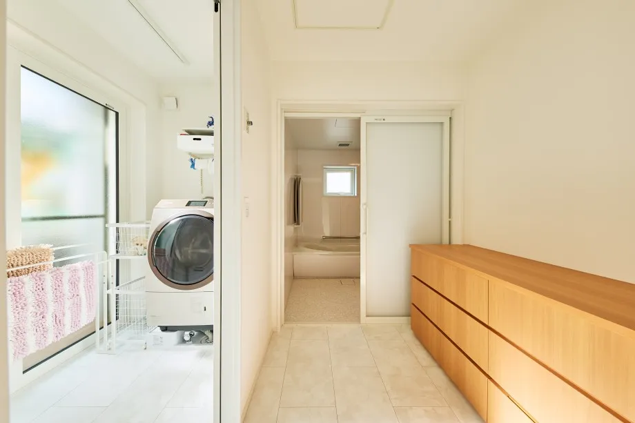 奥からランドリールーム、洗面スペース、脱衣室、そのすぐ隣には浴室という並びで配置した2階の水まわり。
